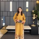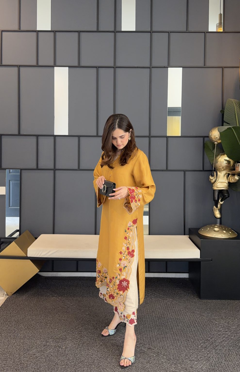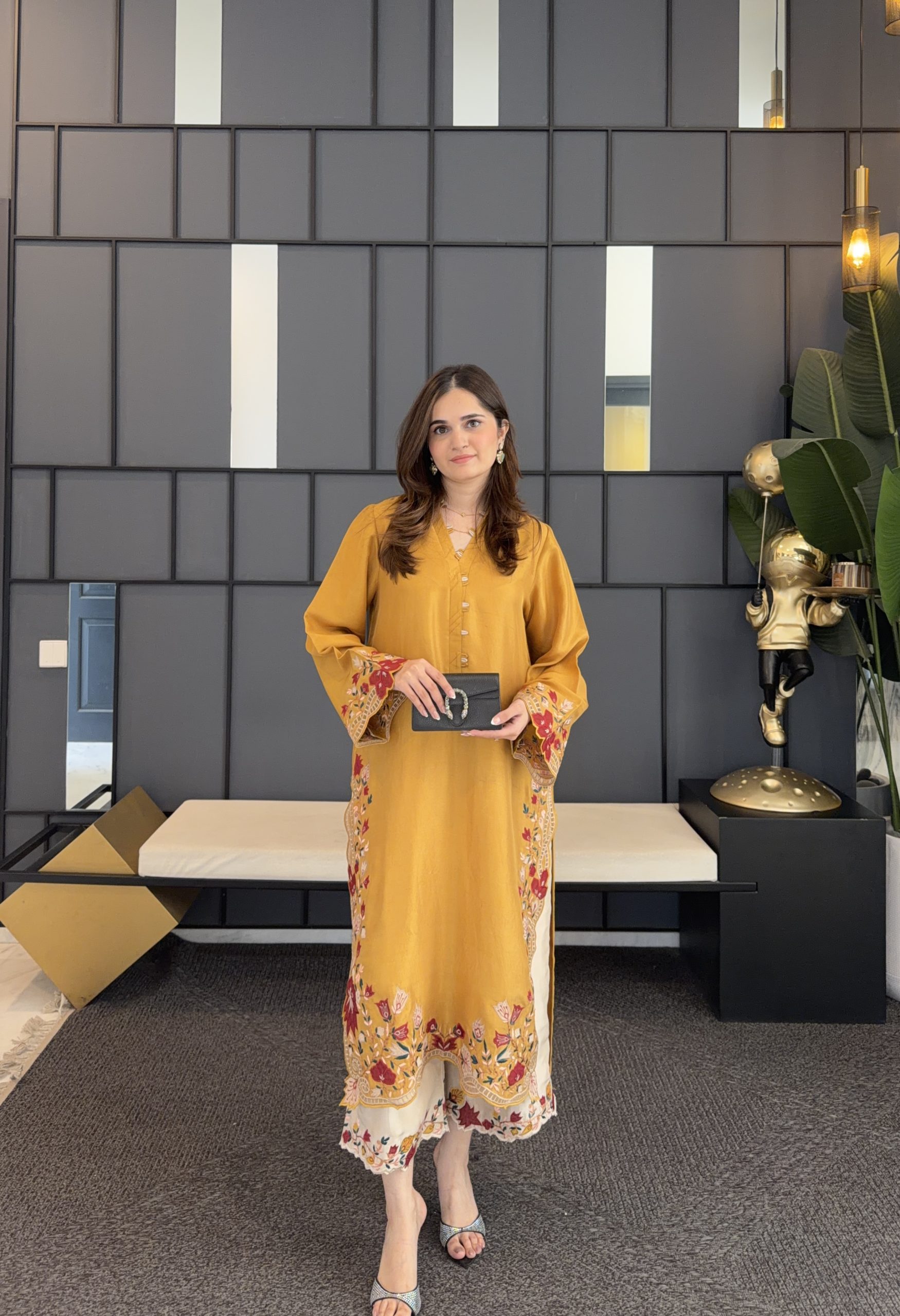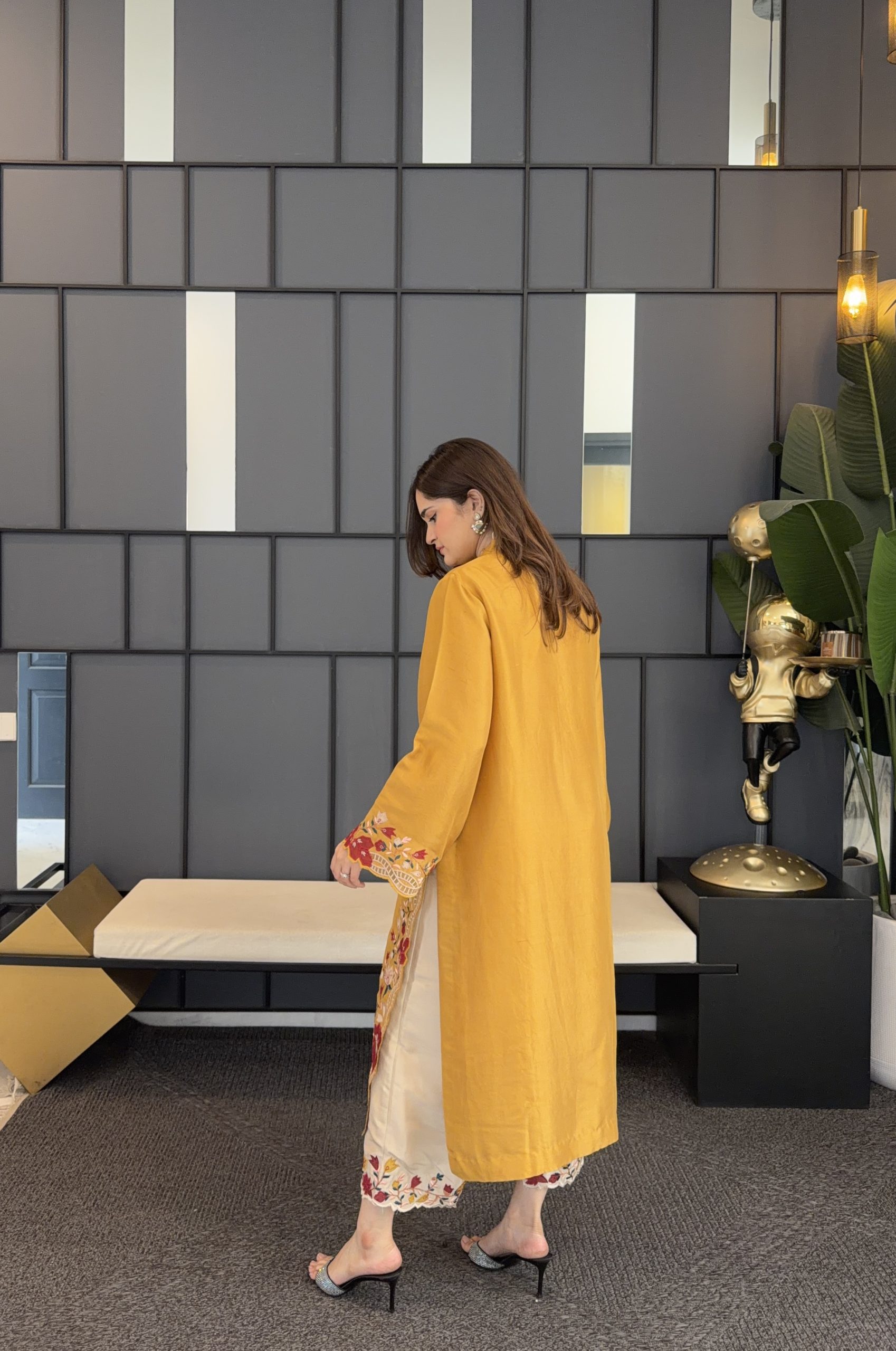 Embrace easy-going elegance this season with our mustard kurta, featuring multi-coloured floral appliqué. Pair it with our contrast izaar for a more defined look.