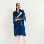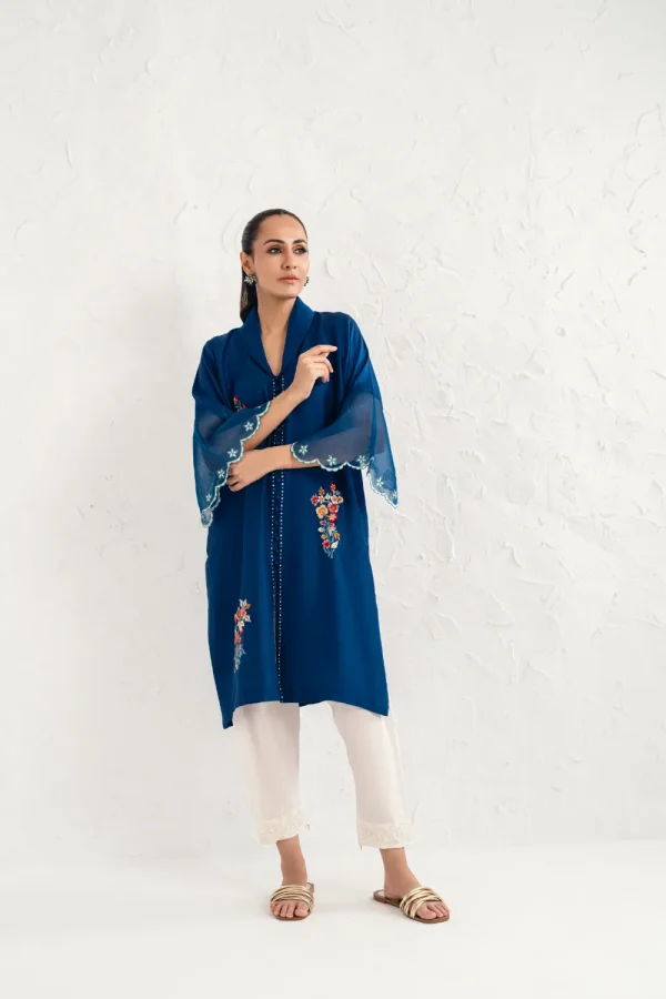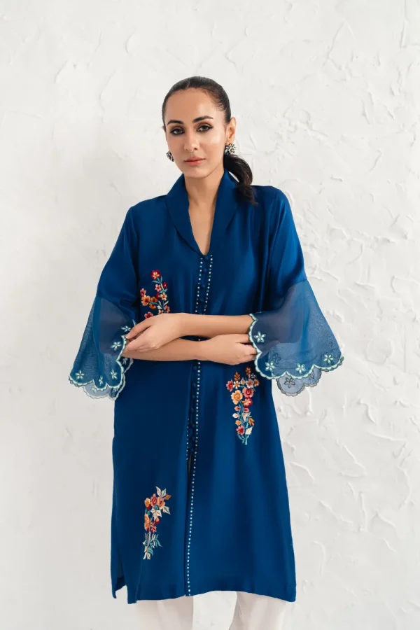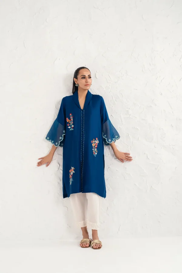 This kurta embodies relaxed sophistication. It is adorned with fine multi-hued resham embroidery and floral motifs. Can be paired with our embroidered skinny shalwar, as seen here.