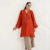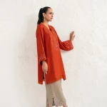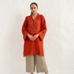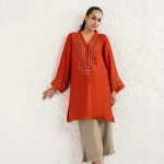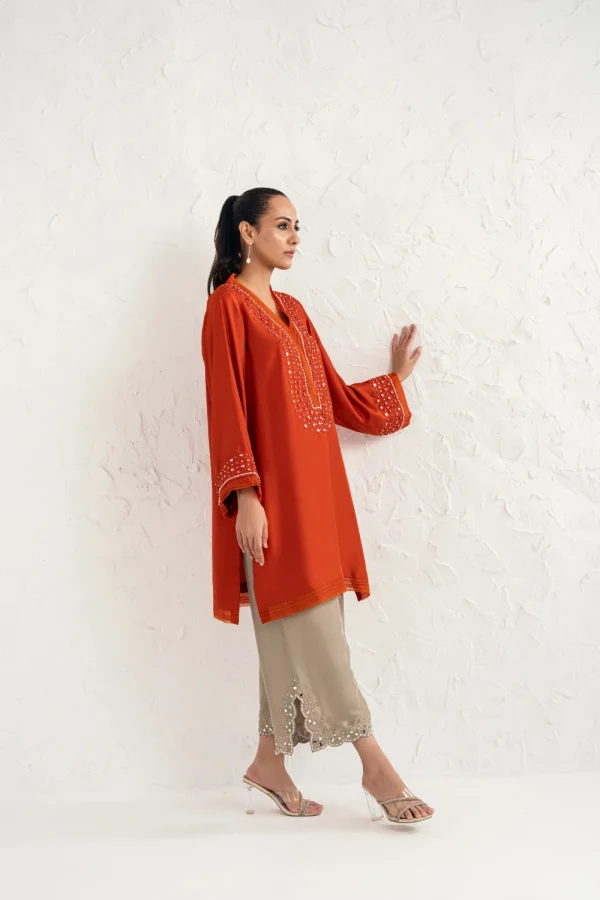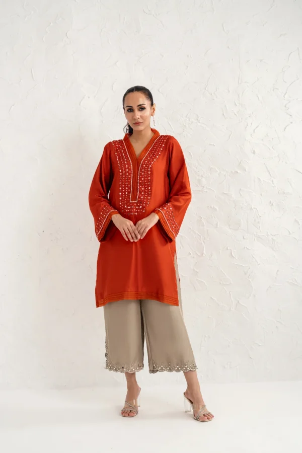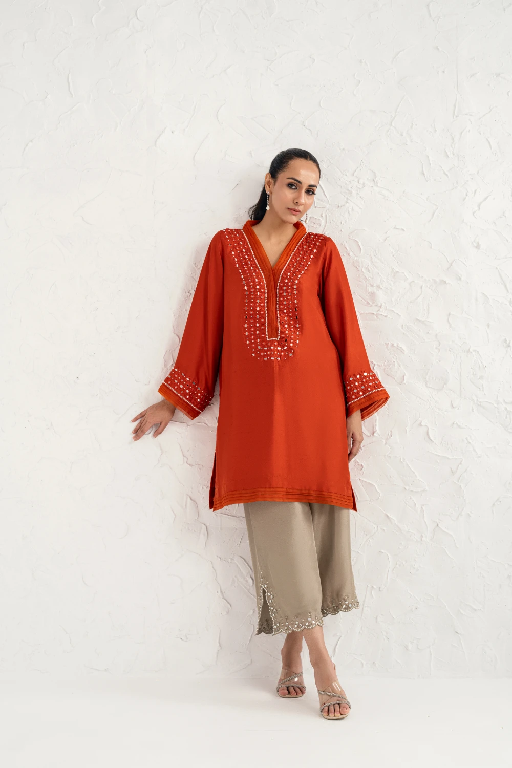 A captivating shade of orange adorned with delicate resham and mirror work for a touch of timeless charm. Embellished with hand embroidery, this outfit is a perfect choice for all your events. Finish the look with contrasted embroidered culottes.