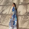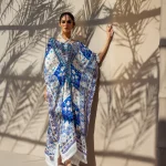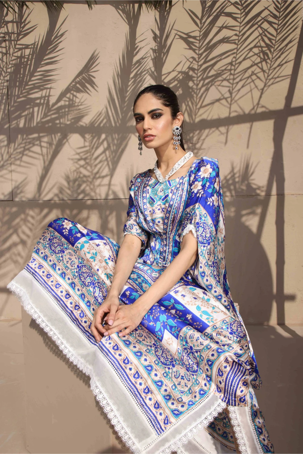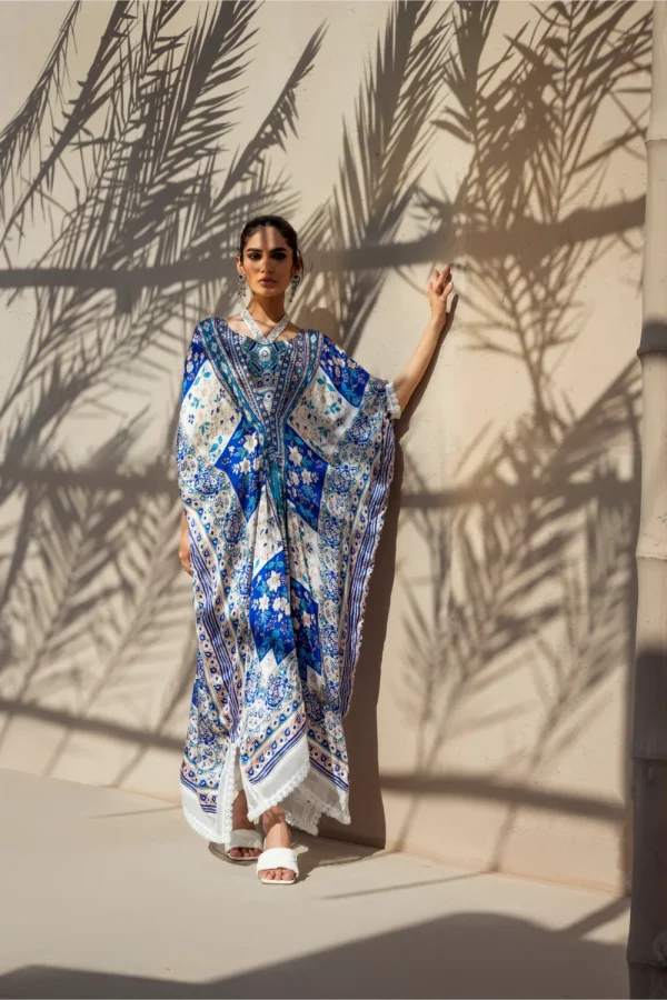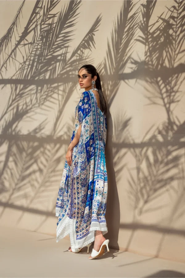 This screen print kaftan is perfect to take you from the party to the festive season. Finished with lace detailing and embellished strap.