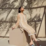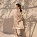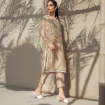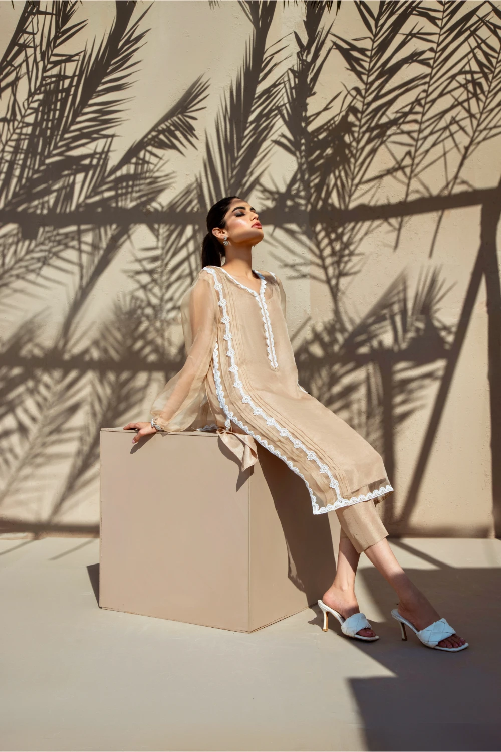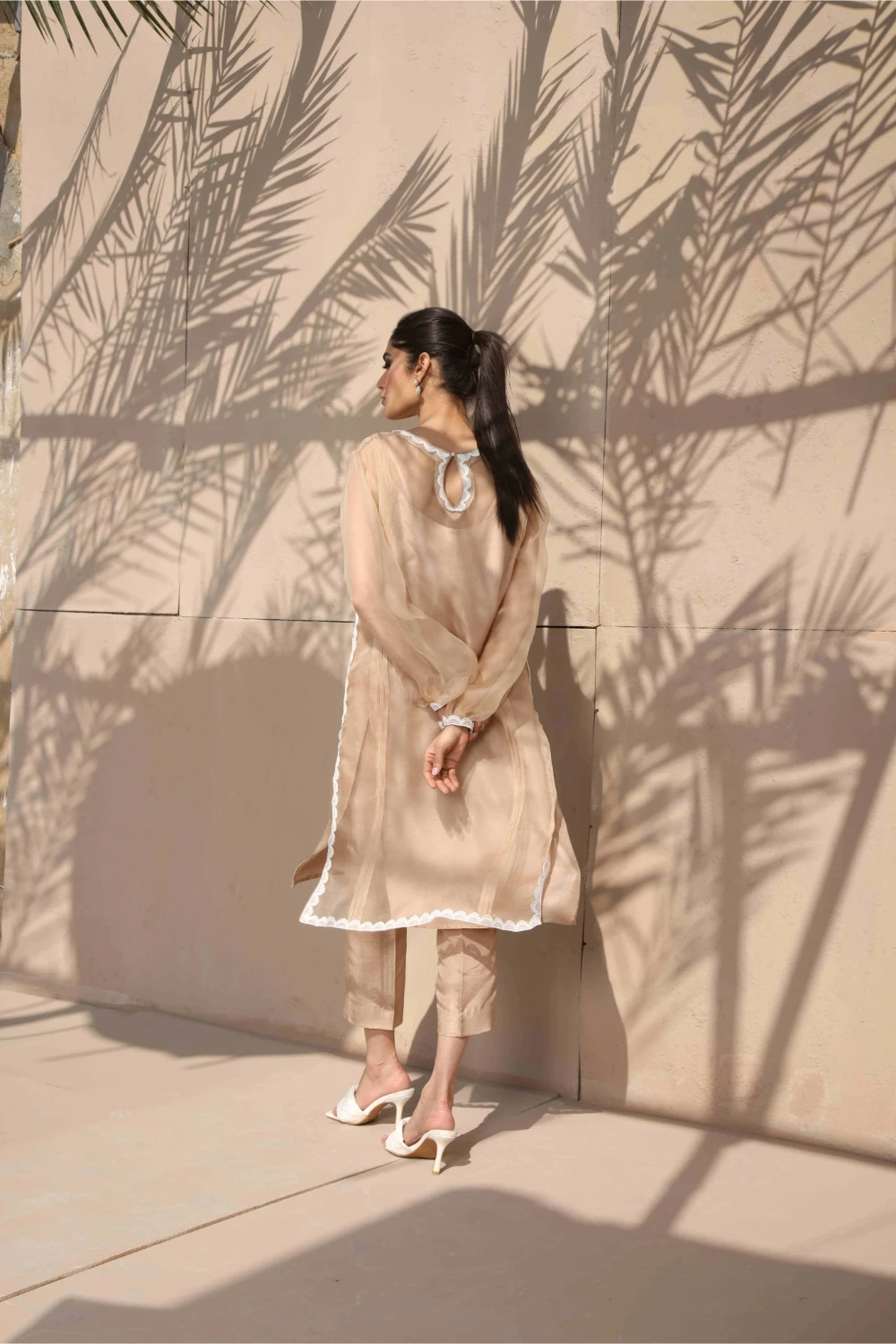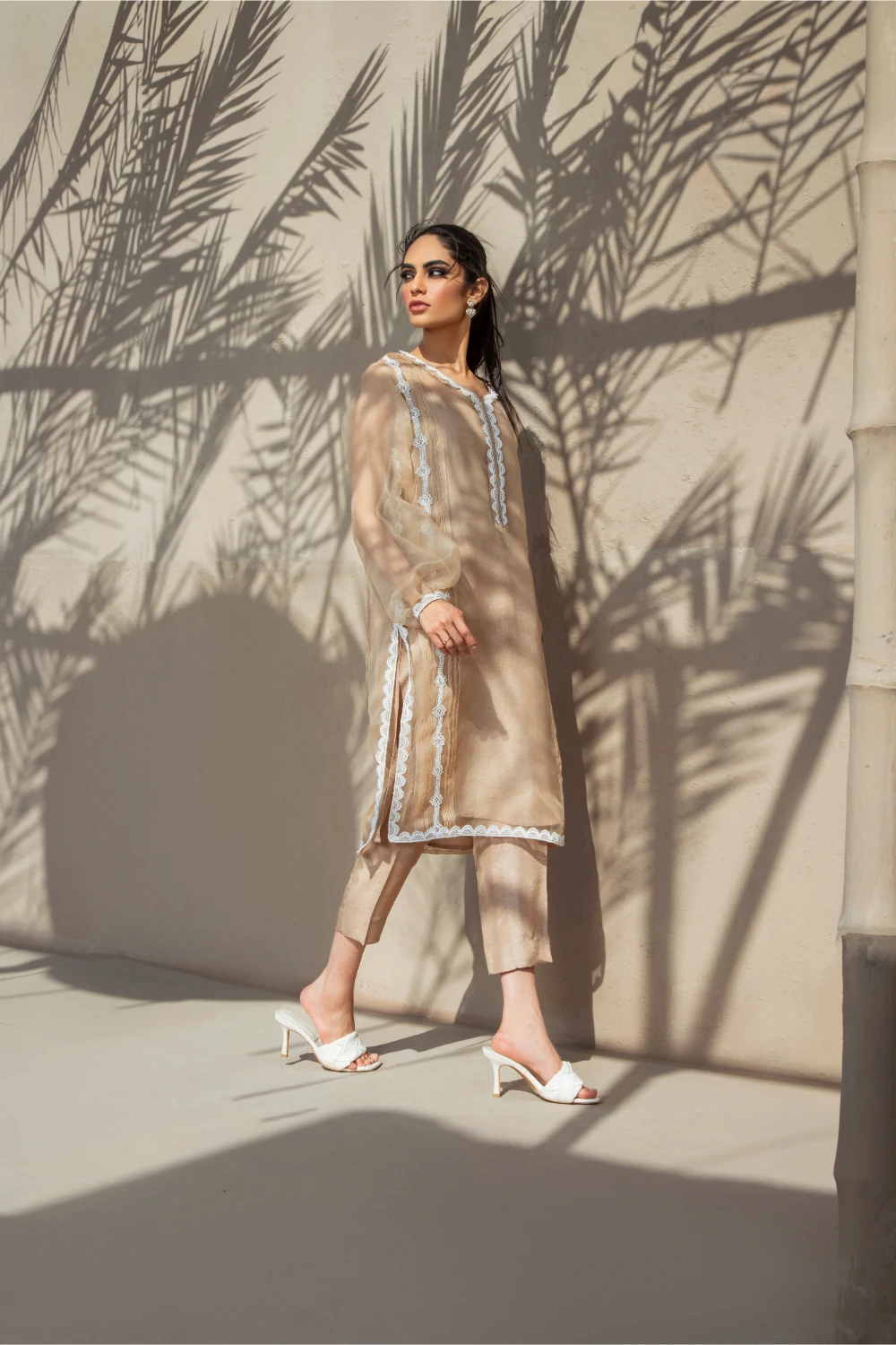 This beige organza shirt with balloon sleeves and lace detailing comes with a spaghetti strap slip and straight pants.