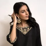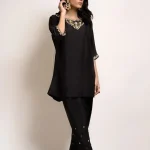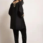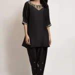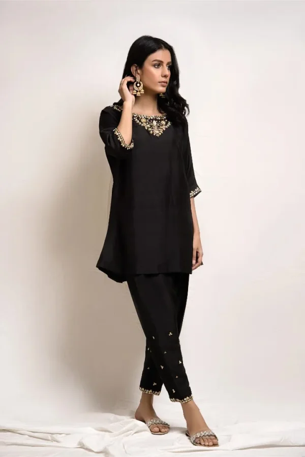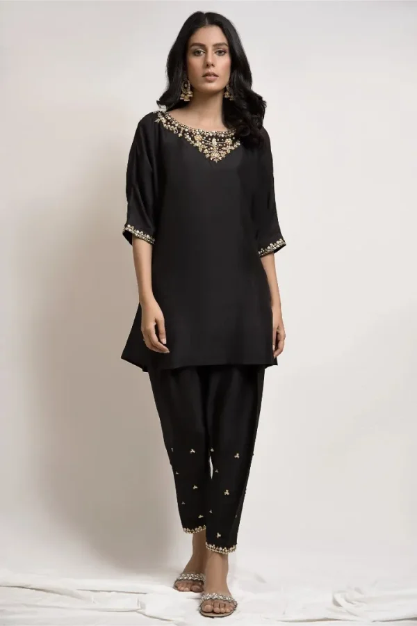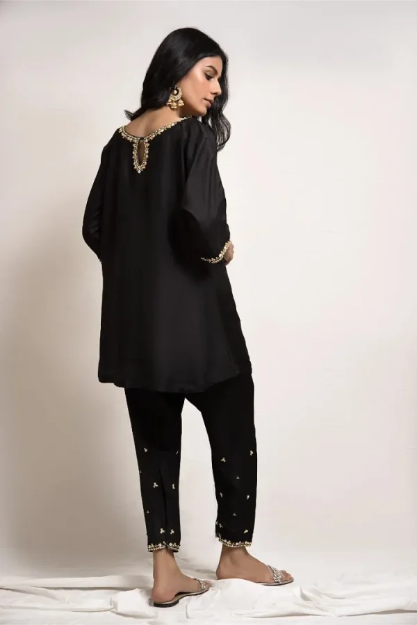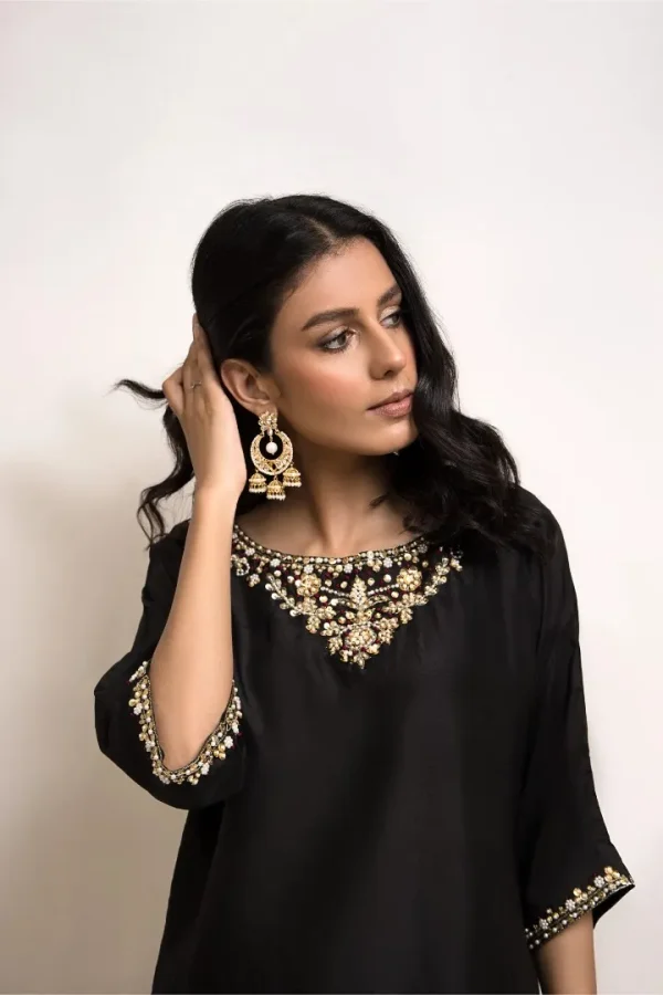 A beautifully crafted black raw silk fabric with subtle hand embroidery on the neckline, sleeves and pant. The look is completed with a matching pant shalwar.