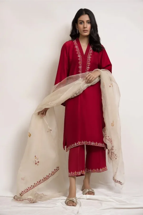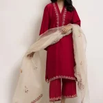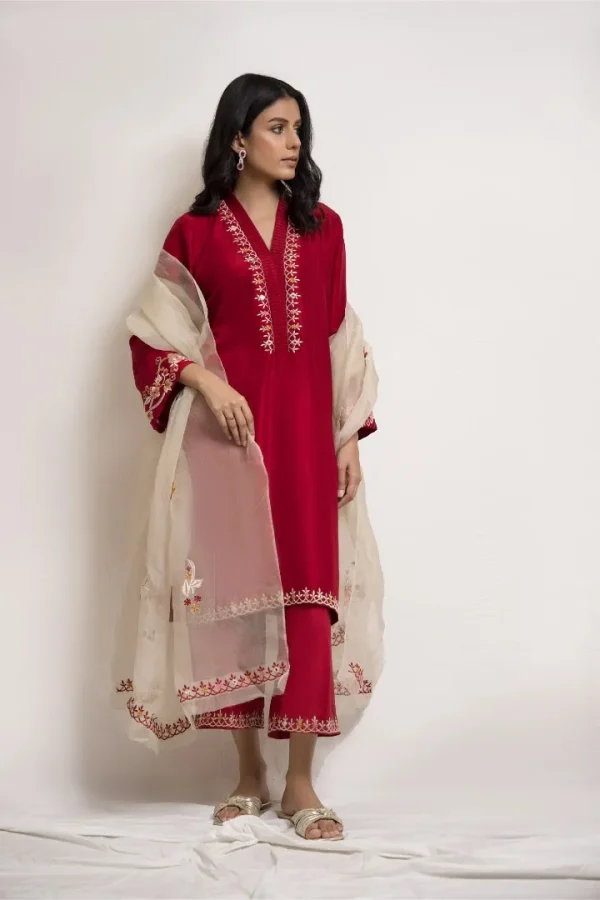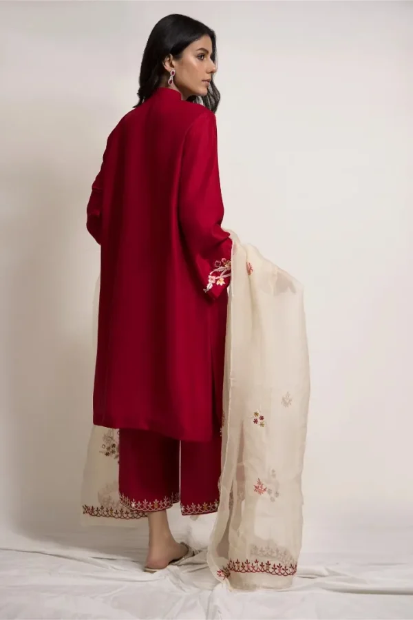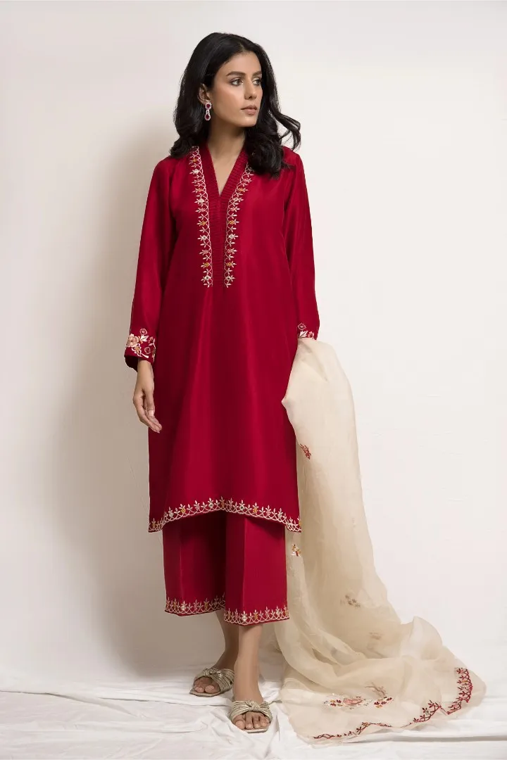 The simplicity and authenticity all wrapped up in this outfit. We bring you a mix of bright and earthy tones with delicate resham and mirror work on pure silk and adding hues in the form of contrast detailed dupatta.