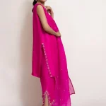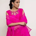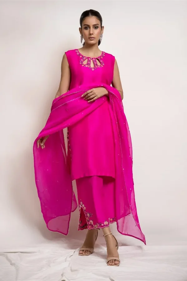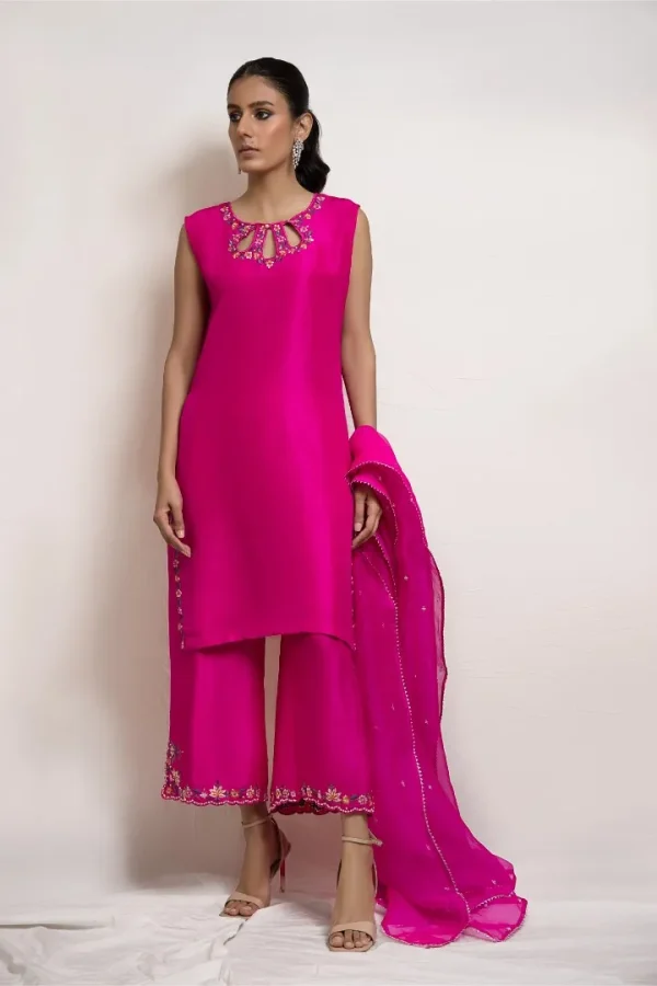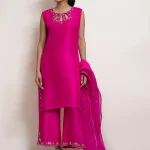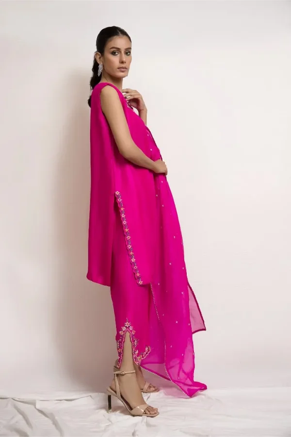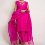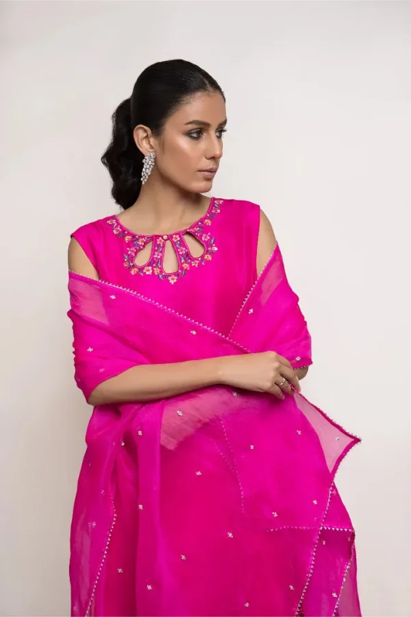 This set can be easily dressed up or down for all your occasions. It features fine resham embroidery in hues of pink along with a touch of hand embroidery. It is paired with a matching crafted culotte and embroidered organza dupatta.
