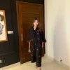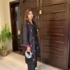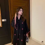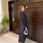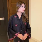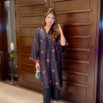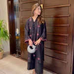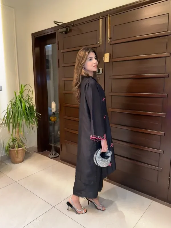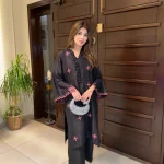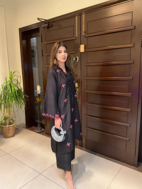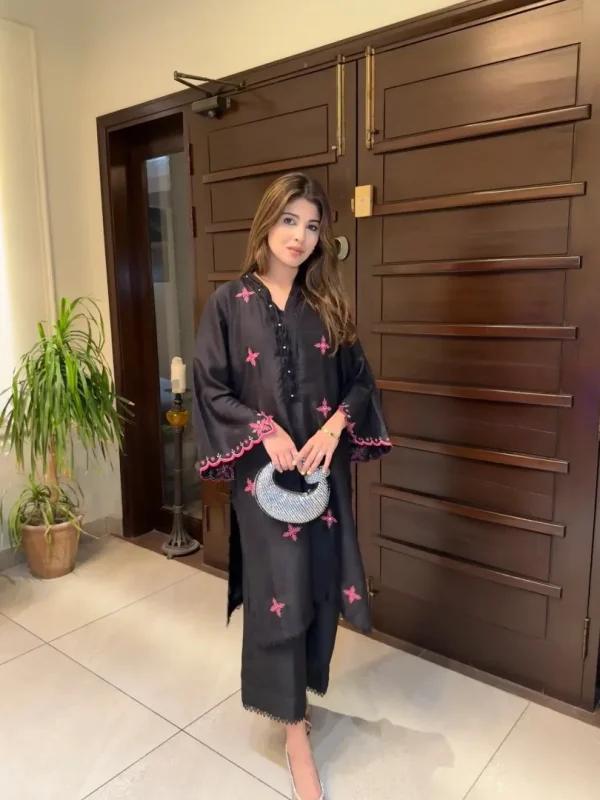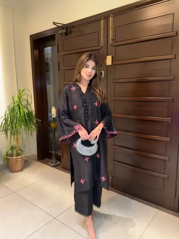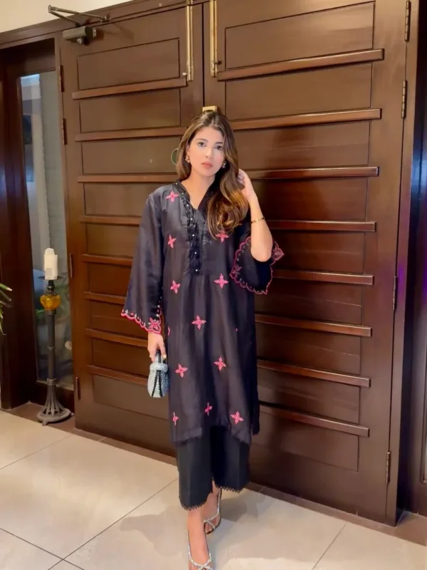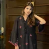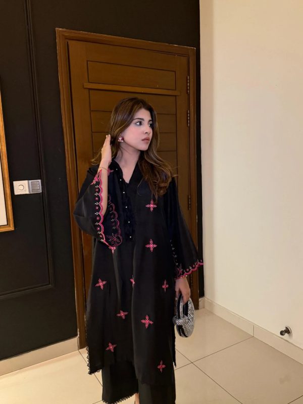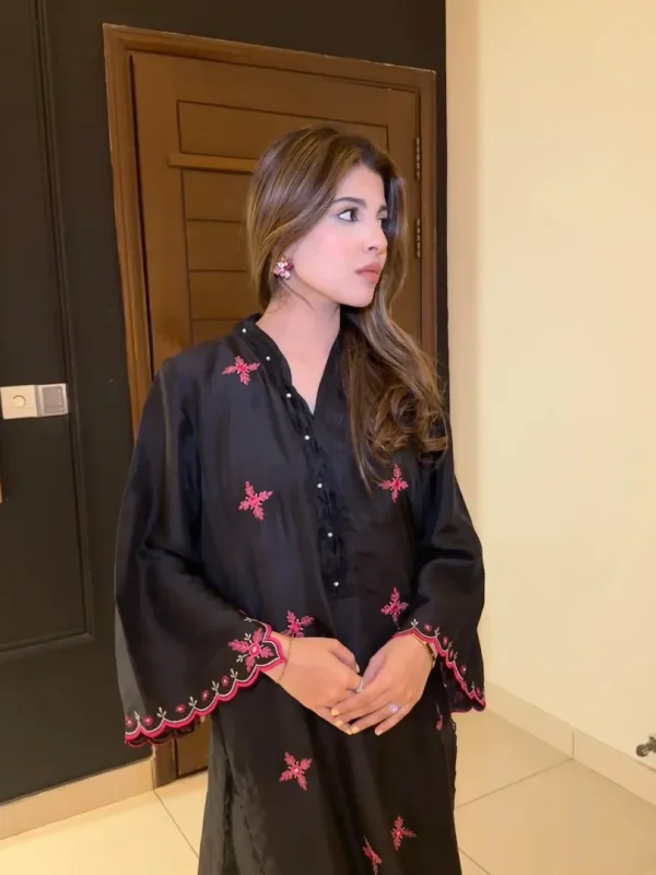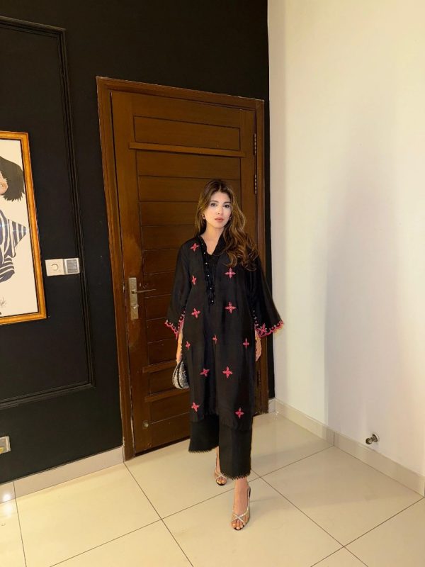 An absolute black shirt with intricate thread and mirror work, scalloped edges and detailed neckline. Paired with a matching culotte to finish the look.