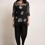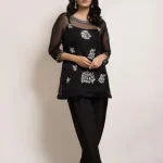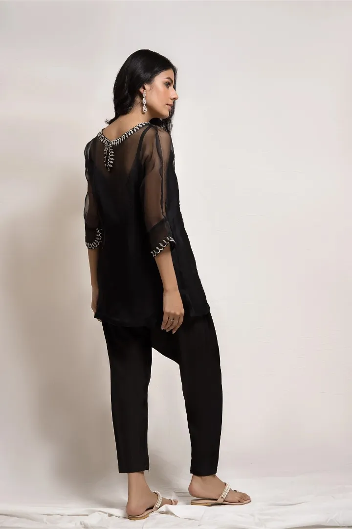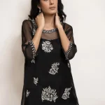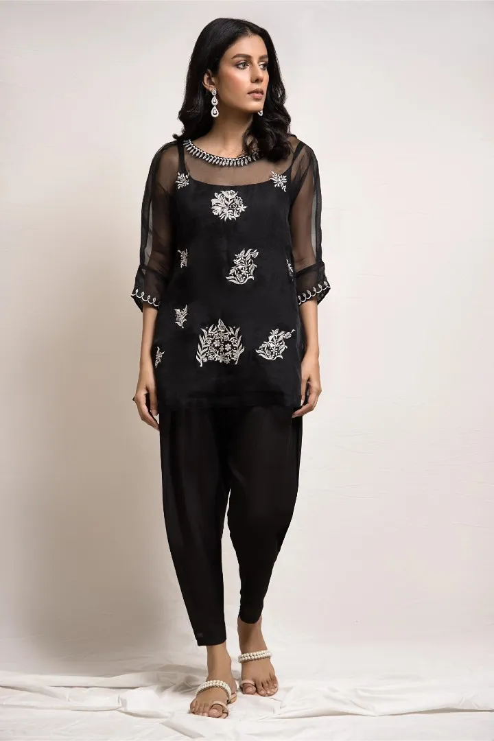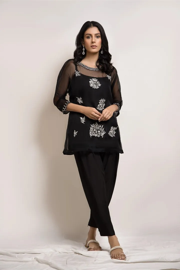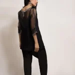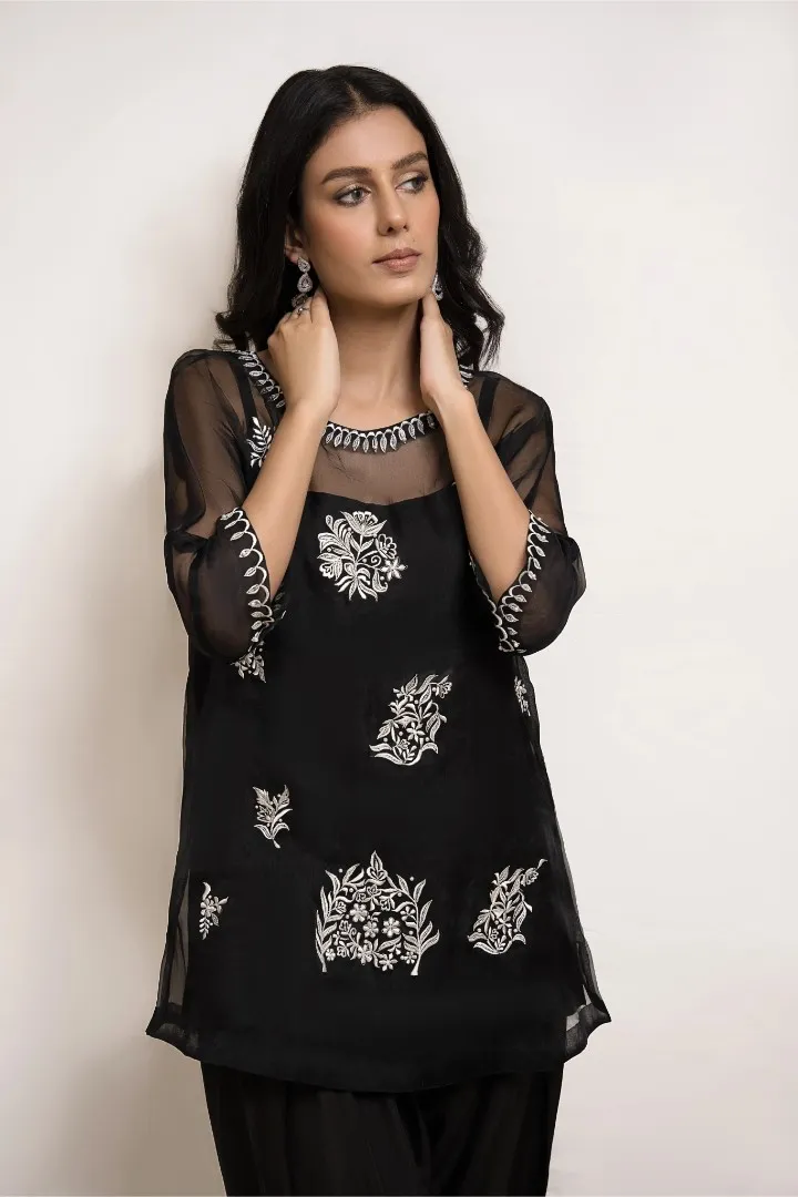 Cut from organza, the black top features resham embroidery and hand crafted embellished motifs. This versatile piece is paired with a matching skinny shalwar and is perfect for all your festive occasions.