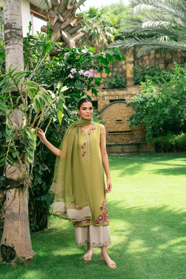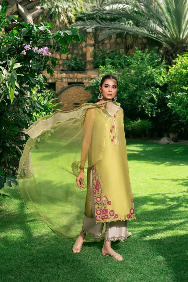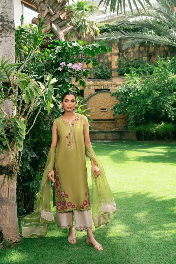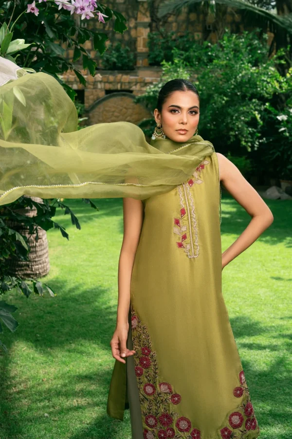 Crafted from pure raw silk, our kurta features multi hued appliqué work with a touch of hand embroidery. Paired here with a contrasting culotte and a lightweight organza dupatta, making it perfect for festive occasions.