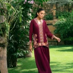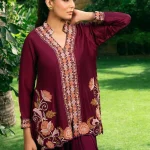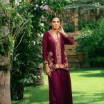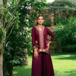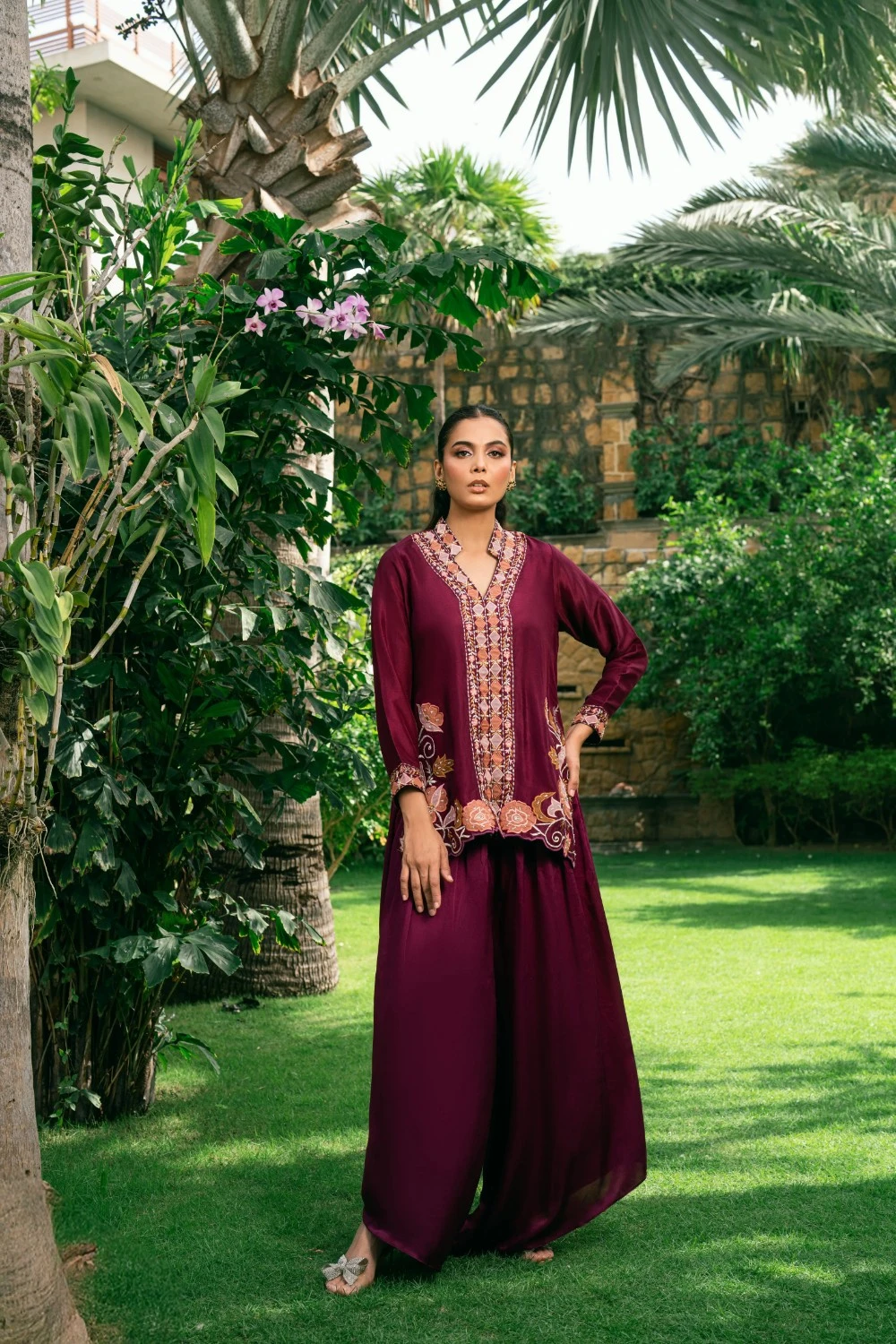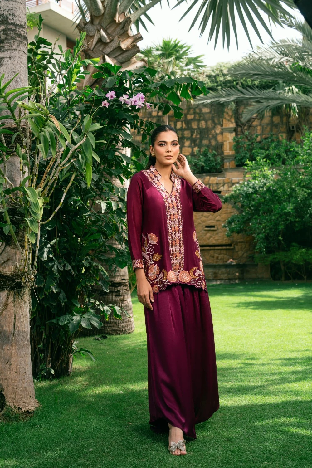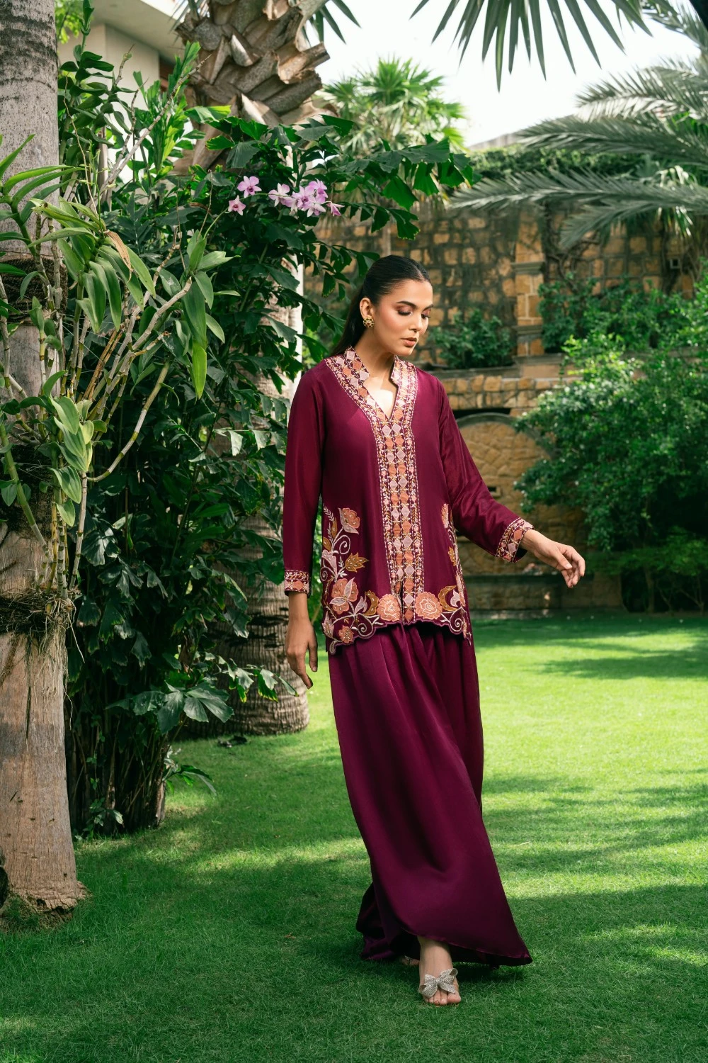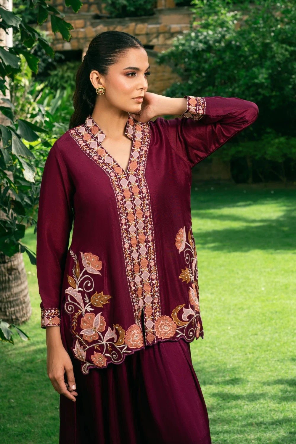 Step into the season with our elegant jacket in luxurious raw silk, paired with matching free flowing pants. Adorned with delicate resham, appliqué and stones, this set is sure to make heads turn.