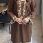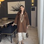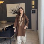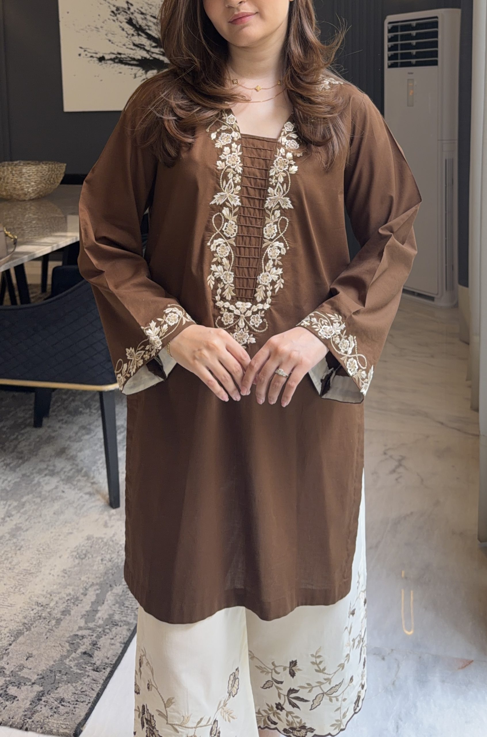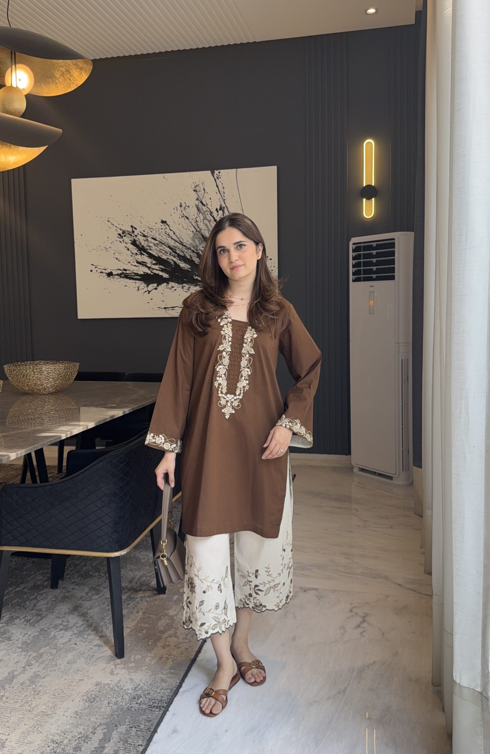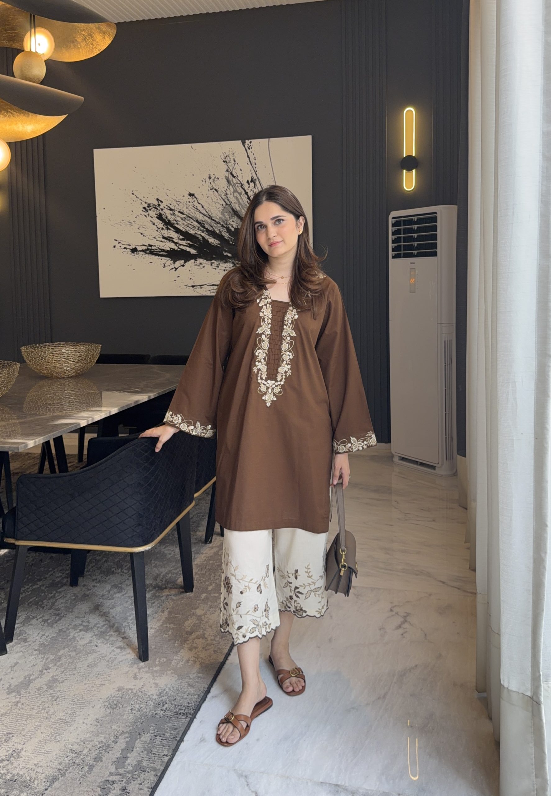 Our brown kurta, adorned with cutwork floral embroidery on sleeves and neck is a perfect choice for the summer. Complete the look with contrasted embroidered culottes.